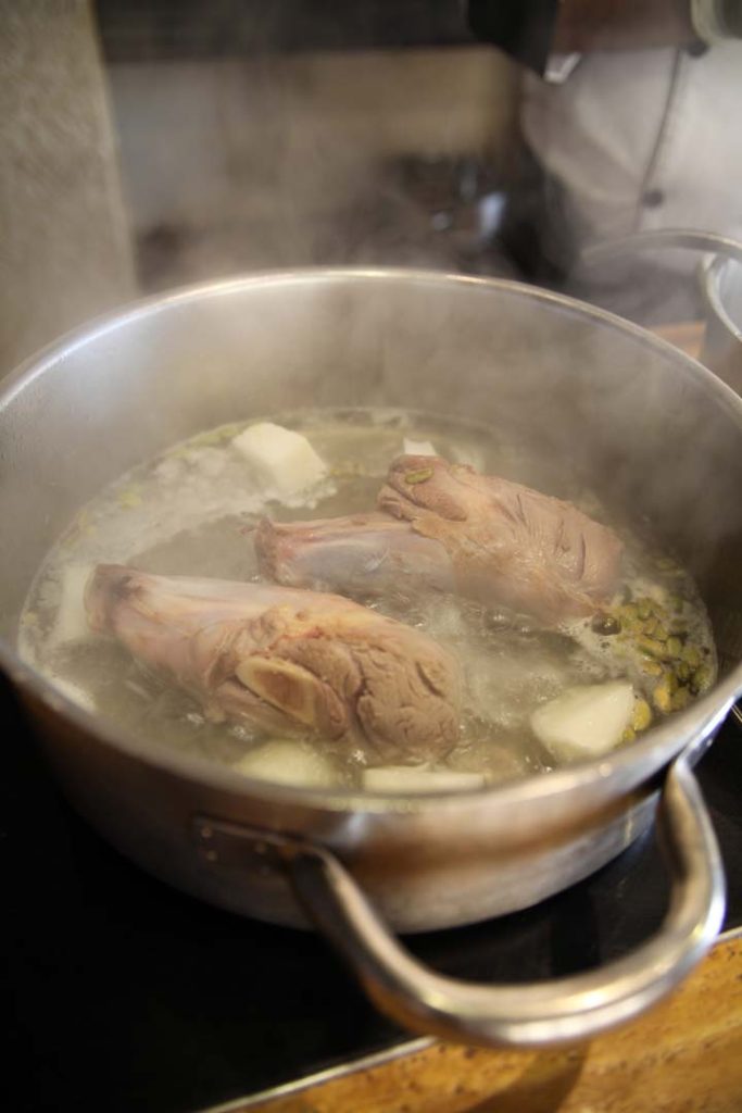 Recouvrir d’eau chaude l’agneau dans une casserole jusqu’à ébullition. Ajouter le sel et le poivre, la cardamome et le bâton de cannelle. Mettre le beurre clarifié. Couvrir et laisser pocher à feu doux pendant une heure.